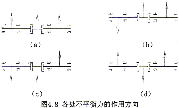在實(shí)際系統(tǒng)中,不平衡力的作用方向是無法預(yù)知的,不妨設(shè)系統(tǒng)不平衡力的作用方向分別如圖4.8a~4.8d所示。各處不平衡量同上。計算了在3處同時具有不平衡力,耦合系統(tǒng)的不平衡響應(yīng)。結(jié)果見圖4.9a~4.9d。從中可以看出,不平衡力作用方向的不同對G軸兩側(cè)的支承軸承有一定的影響,但影響不大,對電機(jī)軸兩側(cè)的支承軸承則幾乎沒有任何影響。