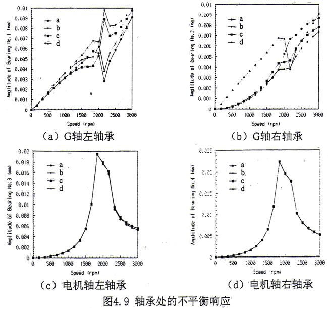 (2)分別在G軸、齒輪聯(lián)軸器和電機(jī)軸上存在不平衡量,計算了耦合系統(tǒng)的不平衡響應(yīng)。計算結(jié)果見圖4.6a~4.6c。