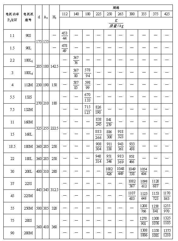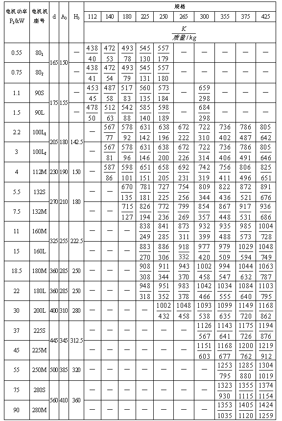 TZLD、TZSD型減速器的實(shí)際傳動(dòng)比i、電機(jī)功率P1和選用系數(shù)K