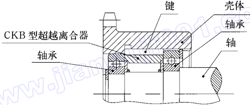 CKB型即國(guó)外B200系列,為無(wú)內(nèi)環(huán)無(wú)軸承支撐的楔塊式超越離合器。使用時(shí),將軸直接安裝在離合器內(nèi),用于離合器的軸在磨削后需要熱處理,硬度達(dá)到HRC58~62,軸的錐度每50mm不應(yīng)超過(guò)0.01mm。為保證軸和離合器外的同心度,承受外環(huán)和軸的徑向或軸向負(fù)載,要在離合器的兩端或一端裝上軸承。適用于極限轉(zhuǎn)速為:1000~2400r/min,公稱轉(zhuǎn)矩為:60~1250N·m。常用于包裝機(jī)、制袋機(jī)、瓦楞紙生產(chǎn)線、減速機(jī)、提升機(jī)、電動(dòng)滾筒等機(jī)械傳動(dòng)。