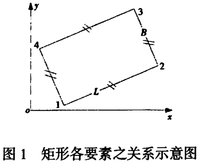 為限制整個圖形的整體位移旋轉(zhuǎn).選擇一基點及旋轉(zhuǎn)角限制3 個自由度,2 對邊的長度(L 、B )限制2 個自由度,這時的矩形就是約束一致,即該矩形是唯一確定的,其各點坐標由下列式子確定: